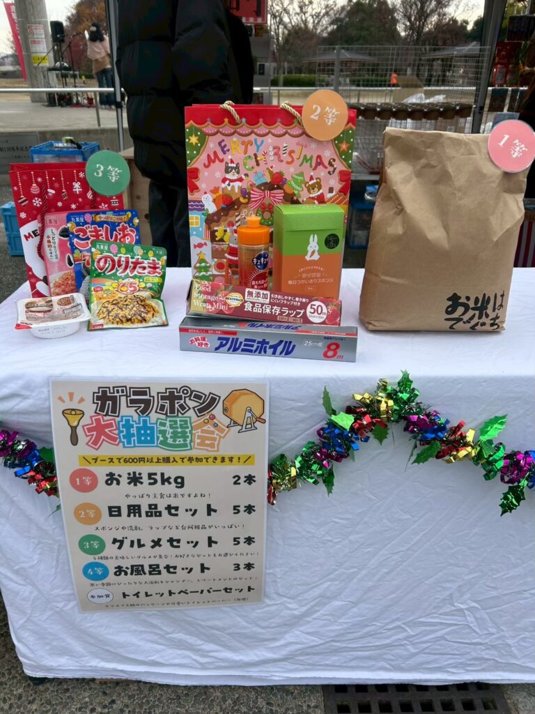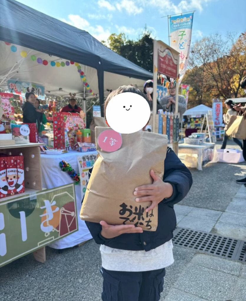 ガラガラ抽選会では、1等のお米を引き当て、小さな体でお米を抱えてくれていました。